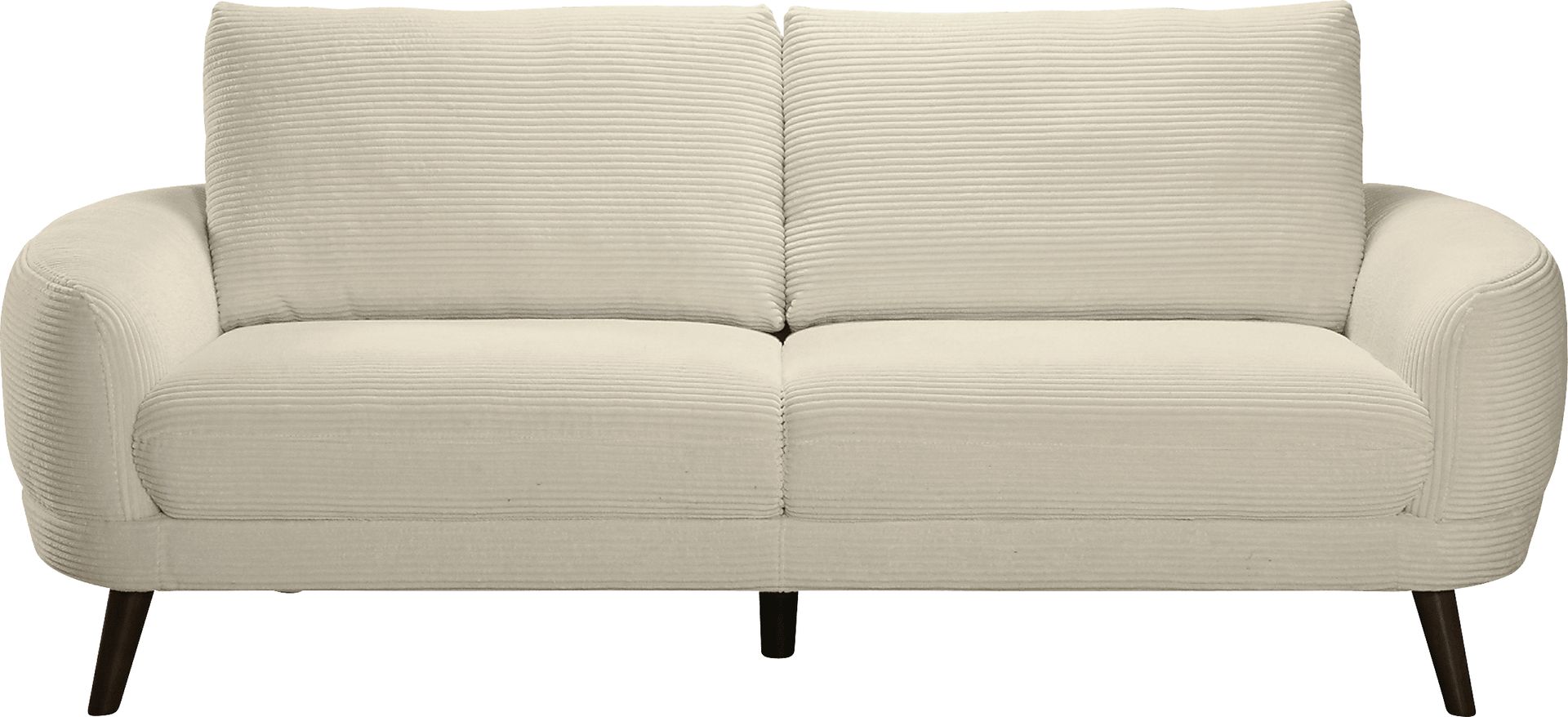Unmistakable energy and a spirit both fresh and iconic make the Penn Station sofa a bold take on timeless style. Sweeping lines upholstered in rich cream corduroy accentuate the dynamic flow of this midcentury-inspired contemporary collection. Wide and inviting track arms taper to soft ridges, their curves echoed in the attached seat cushions. Completing the inward arc of the arms, the base creates a unique hourglass effect against outwardly canted wood legs. Upholstery: 100% Polyester.