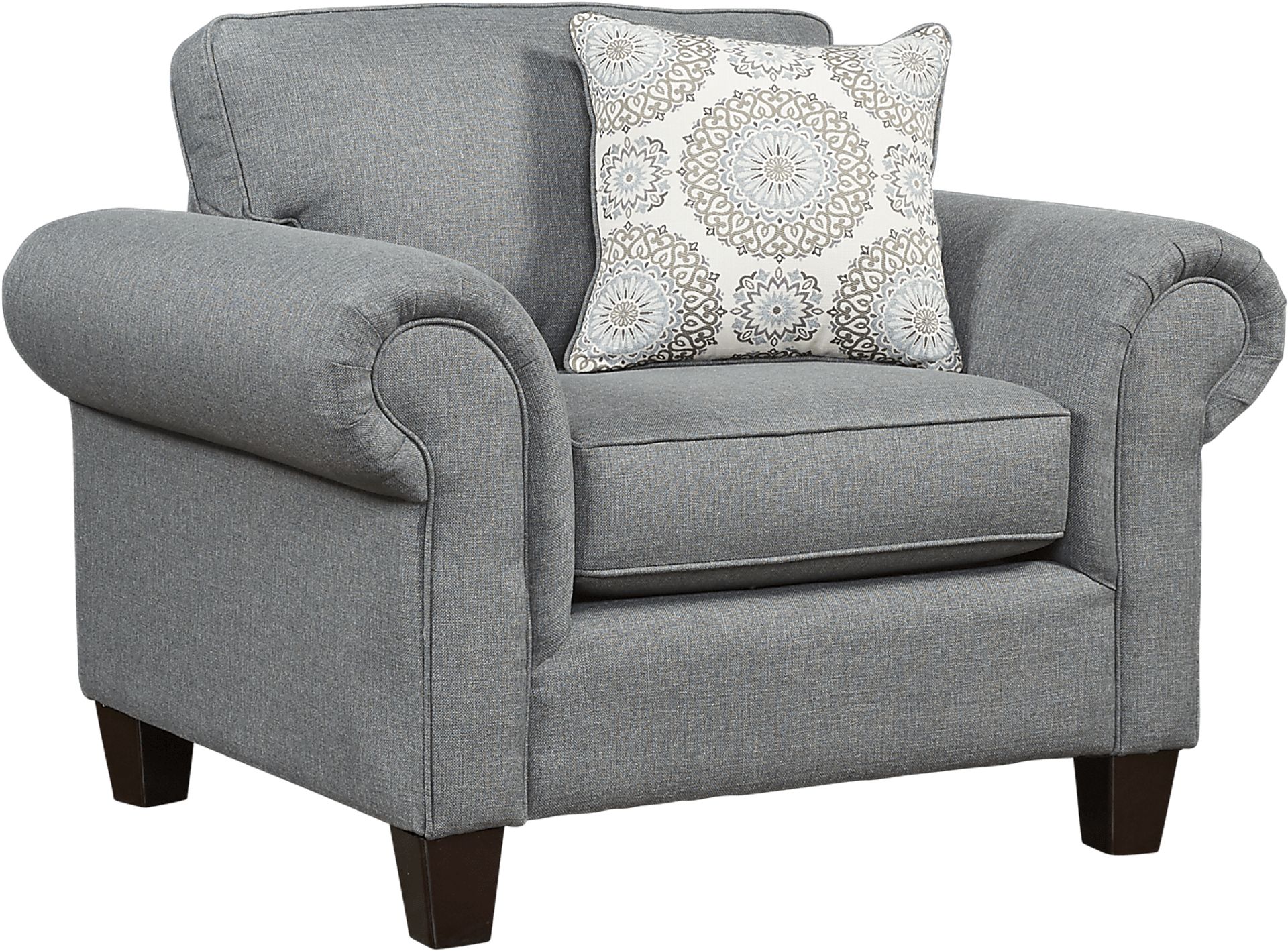 Stylish, sumptuous seating, the Pennington chair adds a sophisticated touch to your living space. Upholstered in plush woven gray fabric, this comfortable chair features padded rolled arms, tapered wood legs and tailored welting detailing. A contemporary accent pillow offers a chic contrast. 100% Polypropylene.