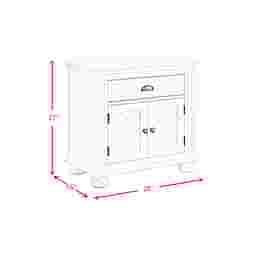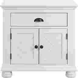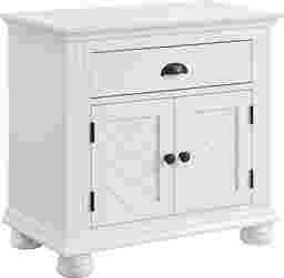 Introducing the Pere nightstand, the perfect blend of style and functionality for your bedroom. The chevron pattern detail on the cabinet door fronts adds a touch of elegance, while the black knob and cup pull hardware give it a modern flair. The drawer is lined with felt to keep your belongings safe and secure, and the dust-proofing bottom layer ensures that this nightstand will last for years to come. Customer assembly is required.