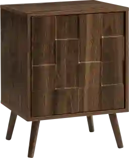 Bring some fashionable style to your living space with the Peritsa brown end table. This dark walnut laminate end table combines fashion and function effortlessly. The durably designed piece features solid wood legs and a push latch mechanism door for practical storage with an adjustable shelf inside. Its space saving design makes it perfect for small rooms, while the easy to clean top ensures low maintenance. Place a lamp, some pictures, or a stack of books on this versatile table that adds a touch of sophistication to a room. Easy to assemble with illustrated instructions included, this modern side table with a mid-century inspired design is a must-have when creating a space with style. Customer assembly is required.
