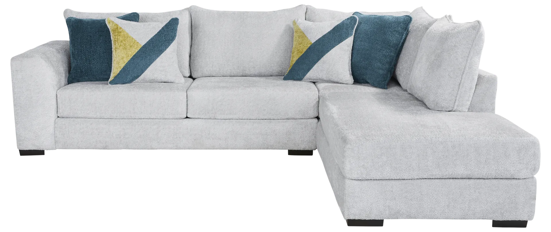 Matching your mood and being a whole vibe are one in the same for the inviting comfort of the Perry collection. Transforming your space into a sanctuary of relaxation and style starts with this transitional sectional's soft woven fabric in a soothing teal color. Rounded wedge arms running from the right-arm facing sofa to the left-arm facing chaise tailor the piece with a sleek but welcoming ambiance. Loose seat cushions provide plush, cloud-like support that will make you want to lounge longer. Dark brown square tapered legs add a refined contrast, grounding the piece with a touch of elegance. Coordinating accent pillows layer the look with a hint grandeur for the perfect final touch. Upholstery: 100% Polyester. Cleaning Instructions: Use water based cleaning agents or foam.