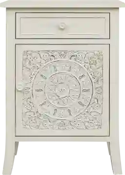 This end table is a signature piece for coastal and bohemian-eclectic styles. The soft white wash finish mimics the look of sun-bleached driftwood, while the intricate circular carvings on the door add a handcrafted, artisanal touch. Based on our design expertise, we recommend pairing it with natural textures like jute rugs or blue-toned accent pillows to enhance the relaxed, breezy atmosphere of a seaside-inspired home.
