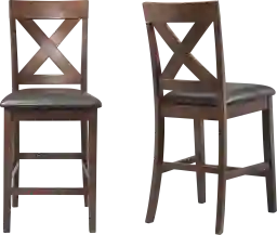 The Petalbite Espresso Counter Height Stool Set is perfect for your dining room. The chairs feature an X-back design and the seats are upholstered in a faux leather fabric adding extra flair to this set. The foam cushion seats will keep you comfortable during long dinners. This set includes two side chairs and ships in one box. The set is finished in a warm, cherry and pairs perfectly with the faux leather upholstery on the chairs. Customer assembly required.