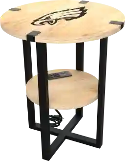 The Philadelphia Eagles laser etched round side table features a modern design that seamlessly blends with various decorative styles. It offers a convenient functionality for charging up to four devices at one time. The 2-Tier shelf also provides ample space to store your TV remote and other small items. Whether you are a Eagles fan or simply appreciate well-crafted furniture, this side table is a versatile addition to any room. Customer assembly is required.