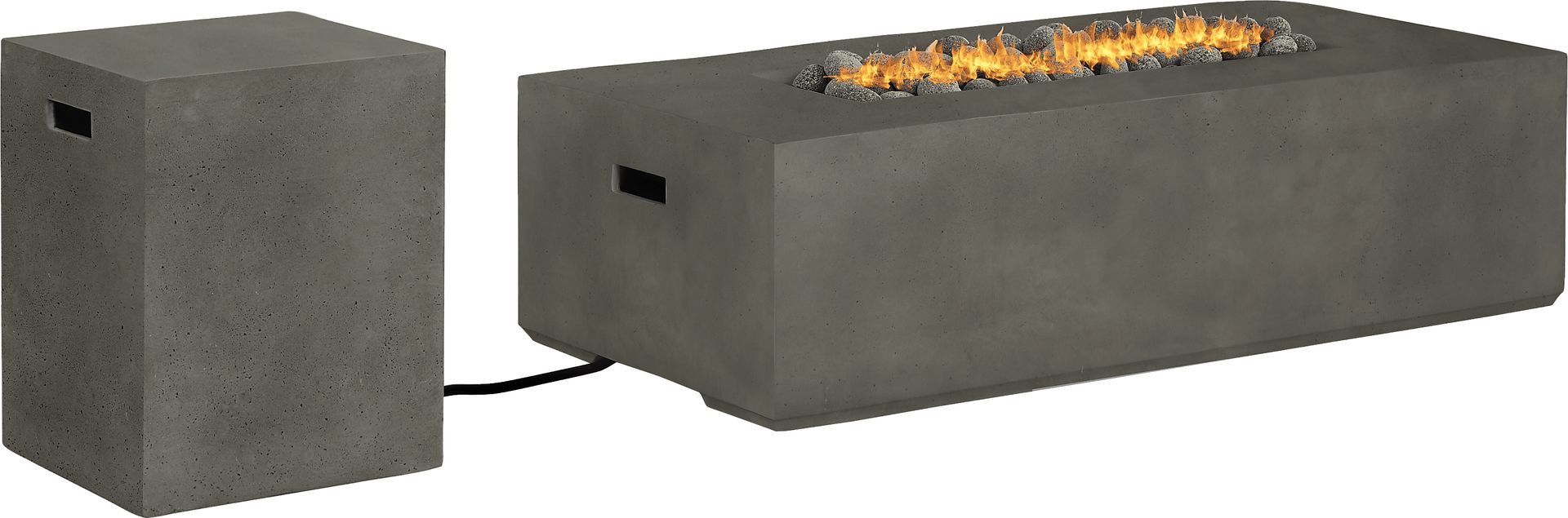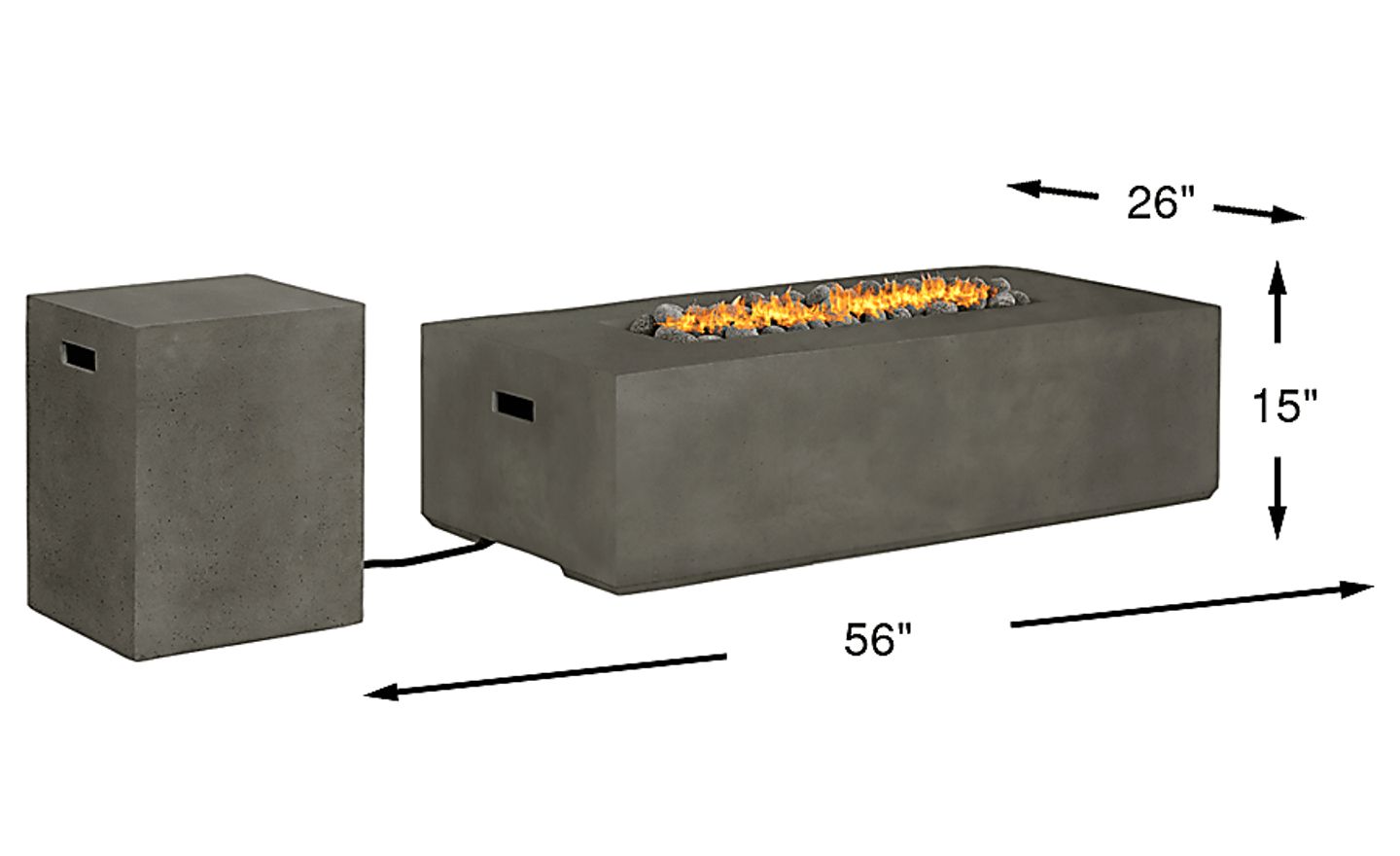 The irresistible allure of nature's elements comes home to light up the night with the Phoenix fire pit. This backyard essential in gray features a timeless rectangle design made of concrete reinforced with glass fibers for exceptional outdoor durability. The entrancing flames brighten any late-night conversation with 50,000 BTUs of dial-adjustable intensity. Large lava rocks add to the natural appeal, and the included tank cover doubles as a matching end table while keeping fuel covered, elevated and neatly out of the way.