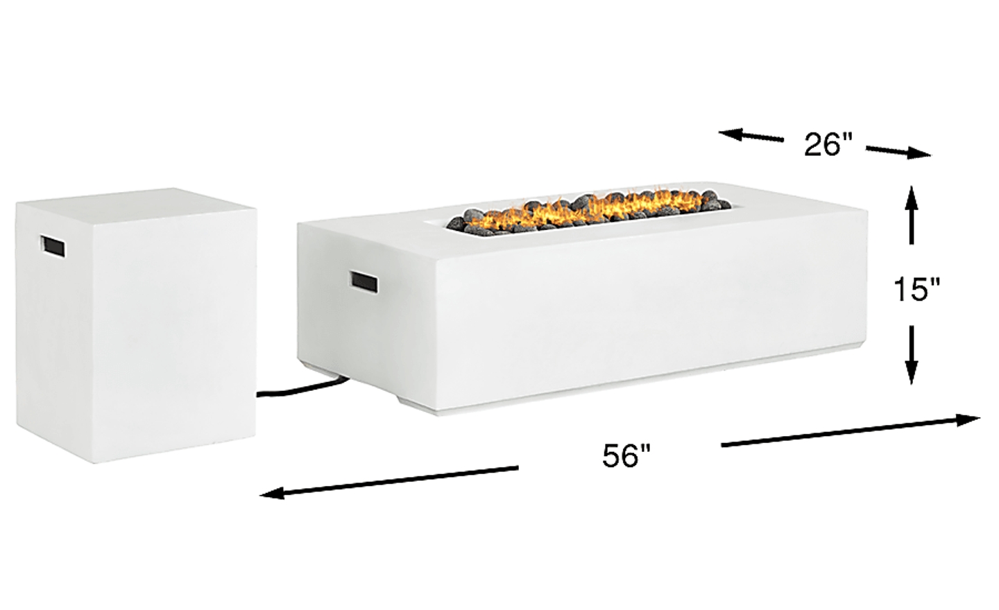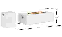 The irresistible allure of nature's elements comes home to light up the night with the Phoenix fire pit. This backyard essential in white features a timeless rectangle design made of concrete reinforced with glass fibers for exceptional outdoor durability. The entrancing flames brighten any late-night conversation with 50,000 BTUs of dial-adjustable intensity. Large lava rocks add to the natural appeal, and the included tank cover doubles as a matching end table while keeping fuel covered, elevated and neatly out of the way.