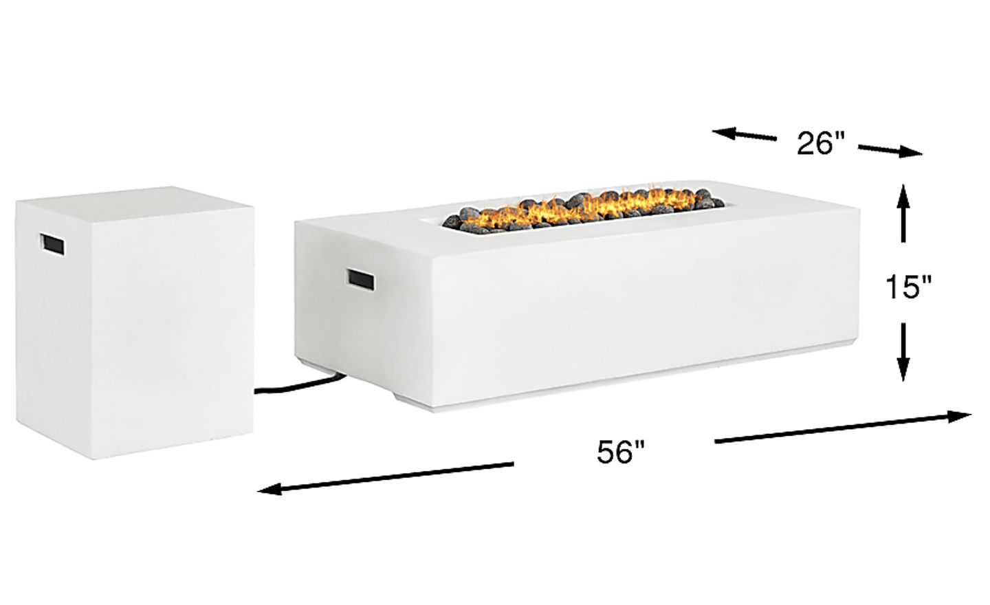 The irresistible allure of nature's elements comes home to light up the night with the Phoenix fire pit. This backyard essential in white features a timeless rectangle design made of concrete reinforced with glass fibers for exceptional outdoor durability. The entrancing flames brighten any late-night conversation with 50,000 BTUs of dial-adjustable intensity. Large lava rocks add to the natural appeal, and the included tank cover doubles as a matching end table while keeping fuel covered, elevated and neatly out of the way.