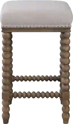 The Pineola stool is a casual statement counter stool featuring spindle turned legs and carved trim finished in a light walnut stain. The plush seat is tailored in a soft ivory linen blend fabric accented with brushed nickel nail head trim. Seat height is 26". Customer assembly is required.