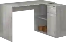 This contemporary style L-shape Pinestone computer desk with a smooth light gray look of wood finish on all sides, features a deep drawer for office supplies, a closed storage cabinet, and two open fixed shelves for books, a small printer, or paperwork. Accented with sleek silver metal handles with a thick panel desk top provides enough room for a laptop or tablet, a lamp, or decorative object. Space saving, a modern design, and ample storage options make this the perfect sized desk for a student or home office. Weight Capacity 100lbs. Customer assembly required.
