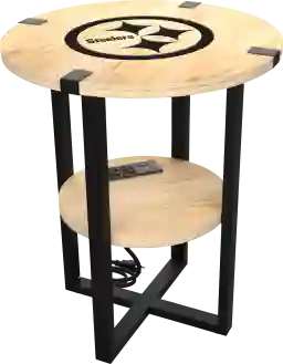 The Pittsburgh Steelers laser etched round side table features a modern design that seamlessly blends with various decorative styles. It offers a convenient functionality for charging up to four devices at one time. The 2-Tier shelf also provides ample space to store your TV remote and other small items. Whether you are a Steelers fan or simply appreciate well-crafted furniture, this side table is a versatile addition to any room. Customer assembly is required.