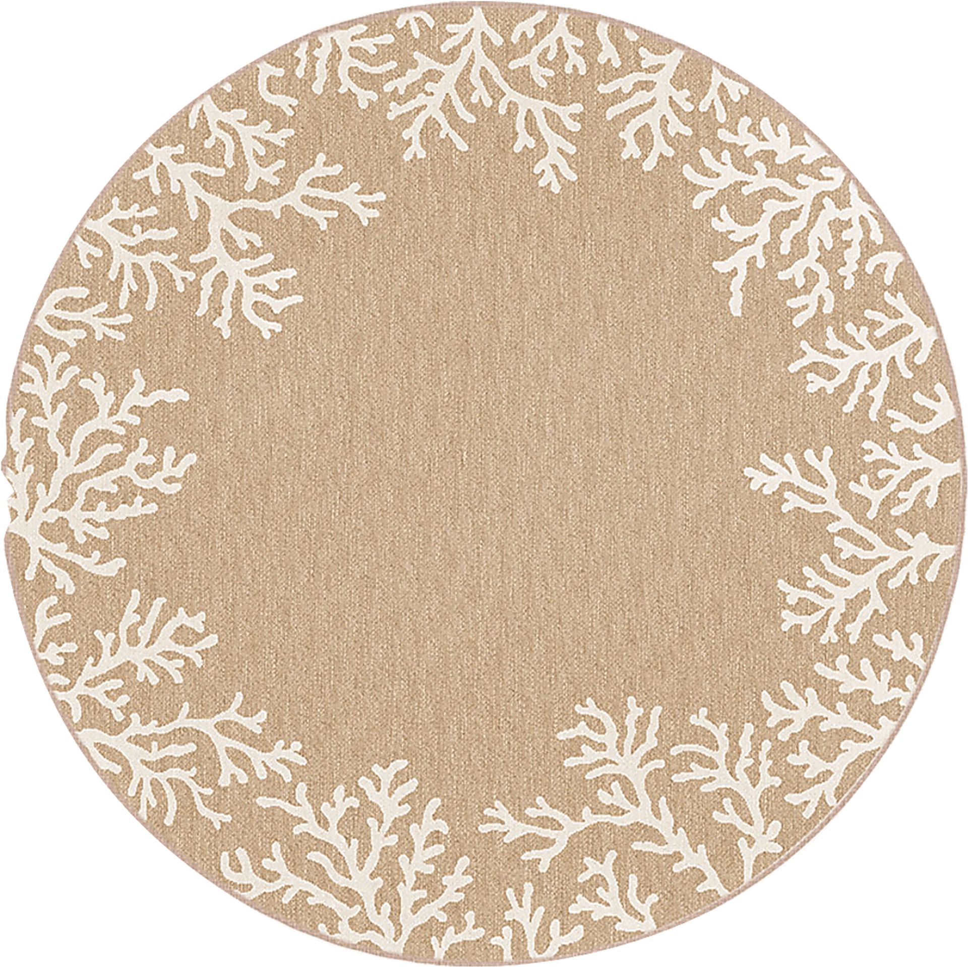 Furnish your favorite indoor or outdoor space with the fun and stylish Placida rug. Featuring a neutral sand color with lighter coral patterns around the edges to create a perfect outdoor space, this versatile round rug works both inside and outside your home for an attractive finishing touch. 100% Polypropylene.