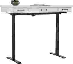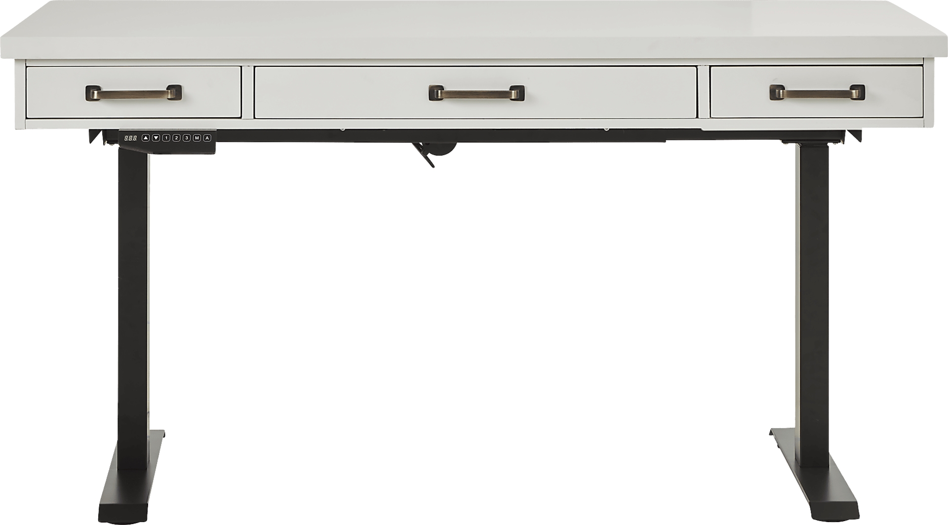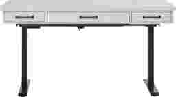 Whether you're nine to fiving from home or just looking to spruce up your work zone, the regal lines and rich definition of the Planefield collection deliver a stunning look for your office set up. Crafted of poplar solids, the desk features an ultra-smooth feel and overall sleek look, complimented by the neat white finish. Just beneath the writing surface, two small drawers and one wide drawer have plenty of room to store supplies like stationery, pens, and more. Each drawer is constructed with durable English dovetail joints in the back of the case and French dovetail joints in the front. Side mounted full extension glides make opening and closing the drawers seamless. Oversized metal pulls in a brass color finish deliver the perfect final polish. The sleek adjustable base can be raised or lowered to a desired work height, allowing you to sit or stand.