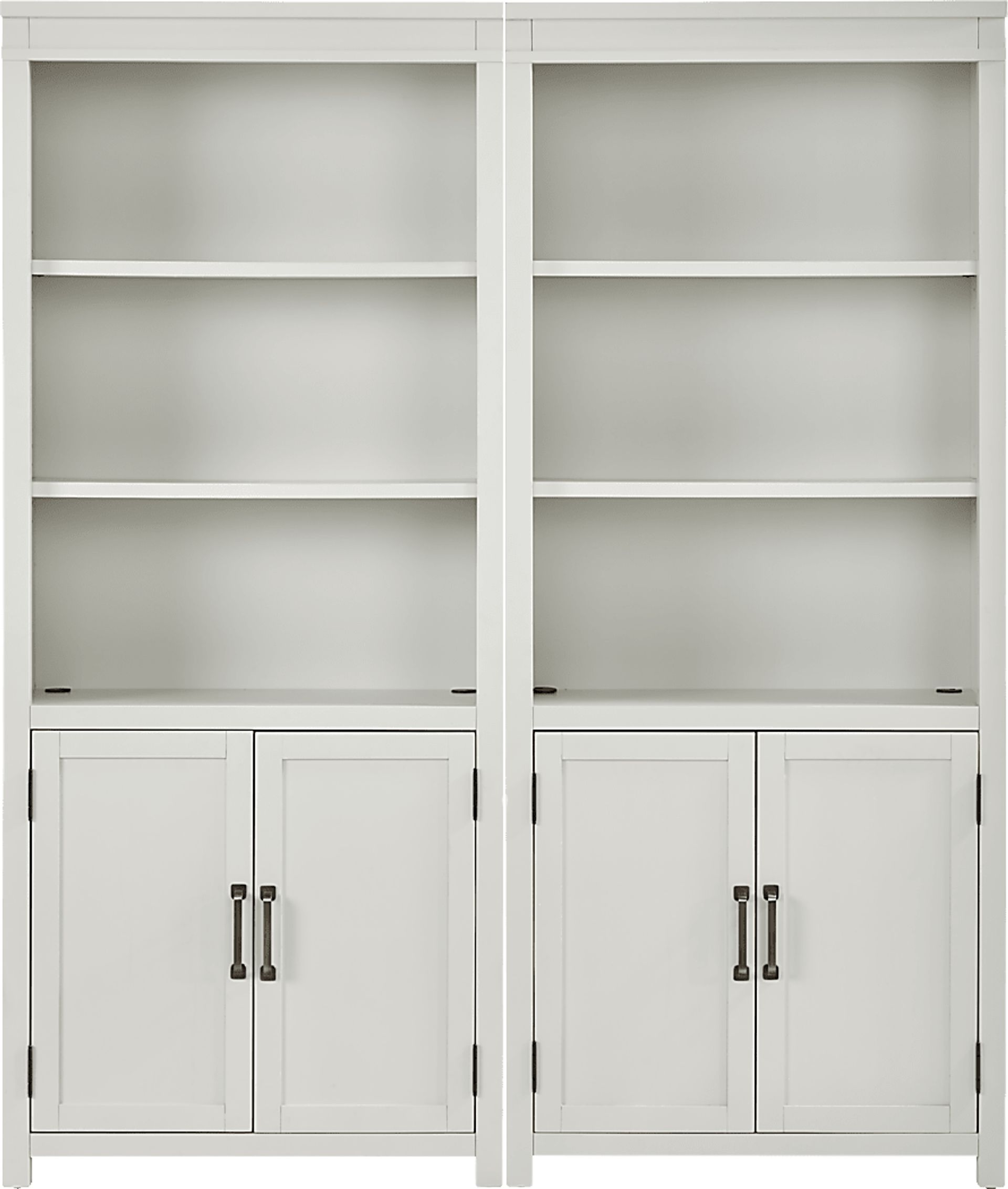 Whether you're nine to fiving from home or just looking to spruce up your work zone, the regal lines and rich definition of the Planefield collection deliver a stunning look for your office set up. Crafted of poplar solids, each bookcase features an ultra-smooth feel and overall sleek look, complimented by the neat white finish. Shelving allows you to organize supplies, display decor and more. Hidden behind the doors on each piece, you can store even more with adjustable shelving. Oversized metal pulls in a brass color finish deliver the perfect final polish.