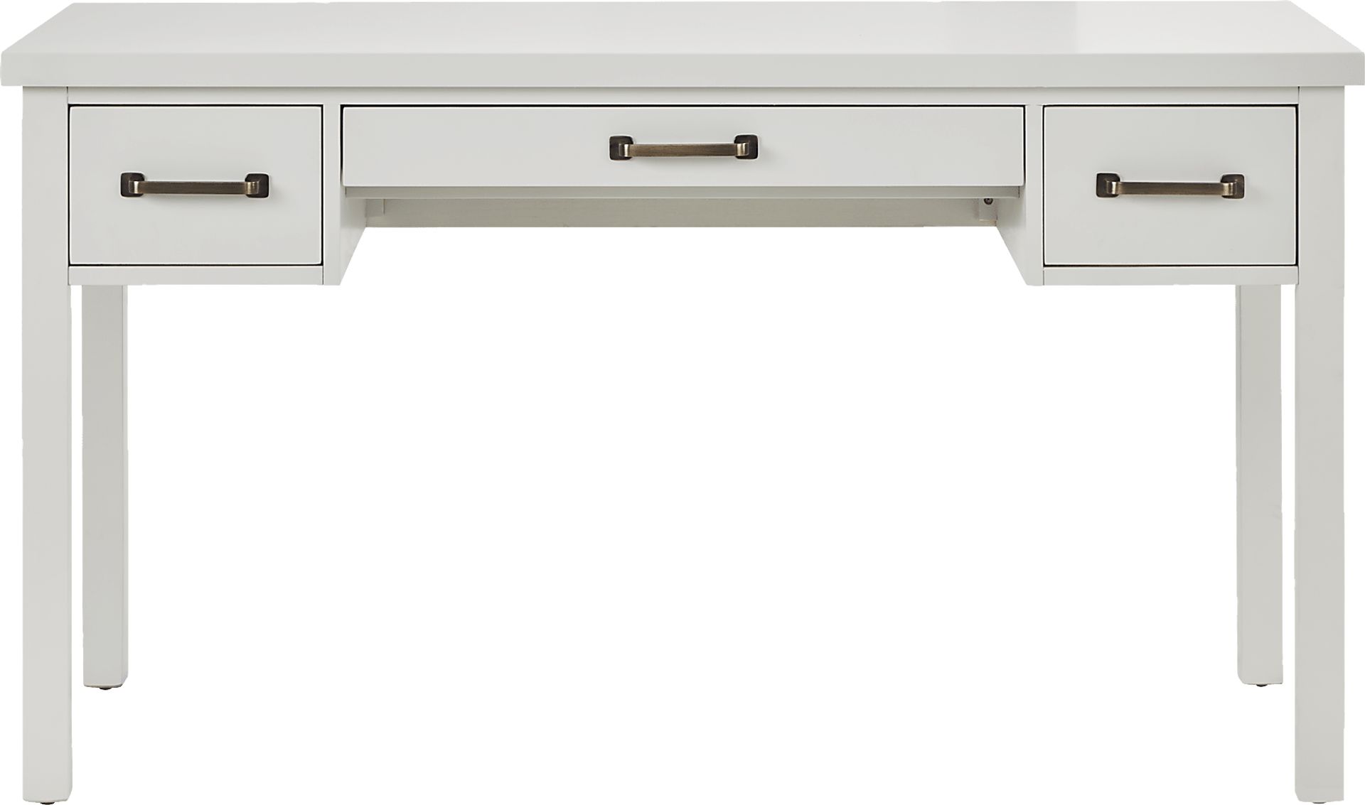 The desk is accented with oversized metal bar pulls in a brass-colored finish. This hardware choice offers a sophisticated, modern contrast to the white poplar frame, making the piece easy to coordinate with other transitional or contemporary decor elements like brass lamps or gold-framed wall art.
