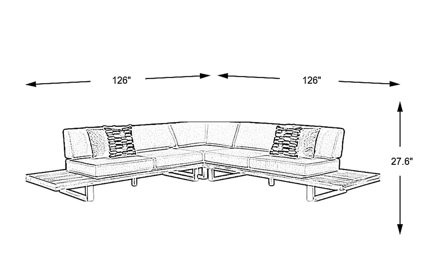 Bring the comfort of indoor furniture outside with the Platform sectional from Fifth & Shore. This impressive sectional is made with contemporary style and durability in mind. This sleek, low profile sectional is crafted with slatted teak and a powder coated aluminum frame. The ultra-durable Sunbrella-covered cushions, in a white sand color, are fade, mold and mildew resistant for long lasting outdoor use. Seating for up to five people is comfortable too, thanks to the breathable nature of the fabric. Four toss pillows add just the right eye catching touch. To clean Sunbrella fabric cushions remove dirt and spray on cleaning solution (water and mild soap), then use a soft bristle brush or sponge. Allow cleaning solution to soak into fabric and rinse thoroughly until soap residue is removed. Air dry. Do not dry clean.