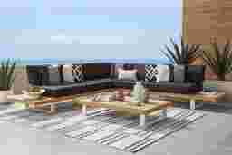 Bring the comfort of indoor furniture outside with the Platform sectional. This impressive piece is made with contemporary style and durability in mind. This sleek, low profile sectional is crafted with solid natural teak and a powder coated aluminum frame. The ultra-durable InsideOut cushions, in a charcoal color, are fade, mold and mildew resistant for long lasting outdoor use. Seating for up to five people is comfortable too, thanks to the breathable nature of the fabric. Four toss pillows add just the right touch. Select cushion colors also available in Sunbrella fabric.