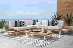 Bring the comfort of indoor furniture outside with the Platform sectional. This impressive sectional is made with contemporary style and durability in mind. This sleek, low profile sectional is crafted with solid natural teak and a powder coated aluminum frame. The ultra-durable Sunbrella cushions, in a vapor color, are fade, mold and mildew resistant for long lasting outdoor use. Seating for up to five people is comfortable too, thanks to the breathable nature of the fabric. Four toss pillows add just the right touch. To clean Sunbrella fabric cushions remove dirt and spray on cleaning solution (water and mild soap), then use a soft bristle brush or sponge. Allow cleaning solution to soak into fabric and rinse thoroughly until soap residue is removed. Air dry. Do not dry clean.