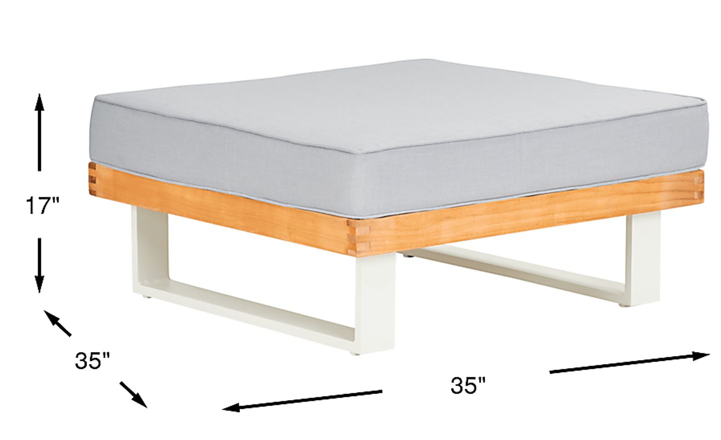 Indoor chic meets outdoor durability with the Platform bumper ottoman. This eye-catching piece boasts a low-profile design along with a slatted natural teak top and powder coated aluminum frame. Ideal for kicking your feet up, the pewter-colored outdoor cushion can also be removed to create the perfect spot for extra refreshments and other patio necessities.