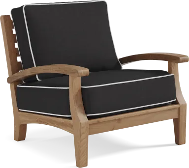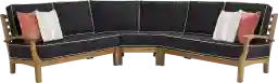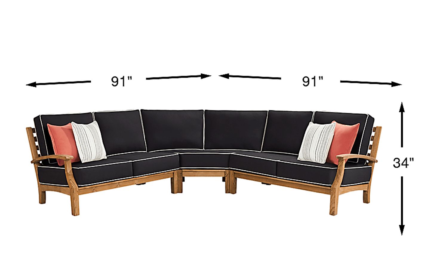 Designed with modern flair to make the most of your patio, the Pleasant Bay sectional combines classic lines with a contemporary silhouette to stunning effect. Crafted from solid teak in a natural finish, this sectional features an open back for a breezy, casual feel. UV-resistant and colorfast Sunbrella cushions in a charcoal color feature coordinating welting details and offer ultimate comfort for outdoor seating. Patterned accent pillows provide this sectional with a decorative finishing touch. 100% Sunbrella fabric. To clean Sunbrella fabric cushions remove dirt and spray on cleaning solution (water and mild soap), then use a soft bristle brush or sponge. Allow cleaning solution to soak into fabric and rinse thoroughly until soap residue is removed. Air dry. Do not dry clean.