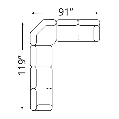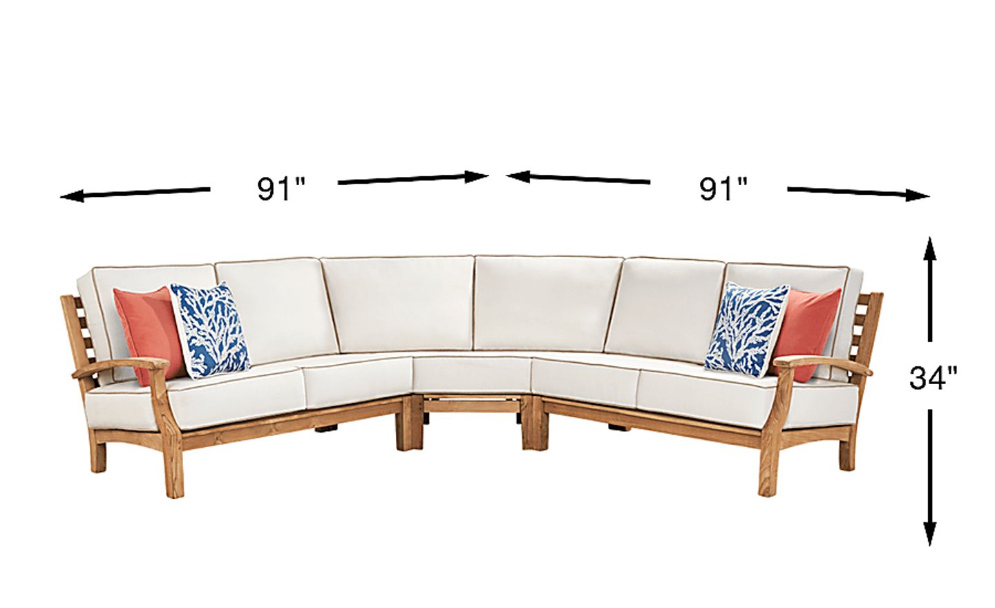 This 3-piece sectional measures 91"W x 91"D x 34"H, creating a symmetrical "L" shape that works well in corner layouts. For an optimal flow on your deck or patio, we recommend mapping out a space that allows for 18 to 24 inches of clearance around the furniture. This ensures plenty of room for walkways and the addition of accent pieces like garden stools or coffee tables.