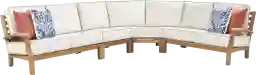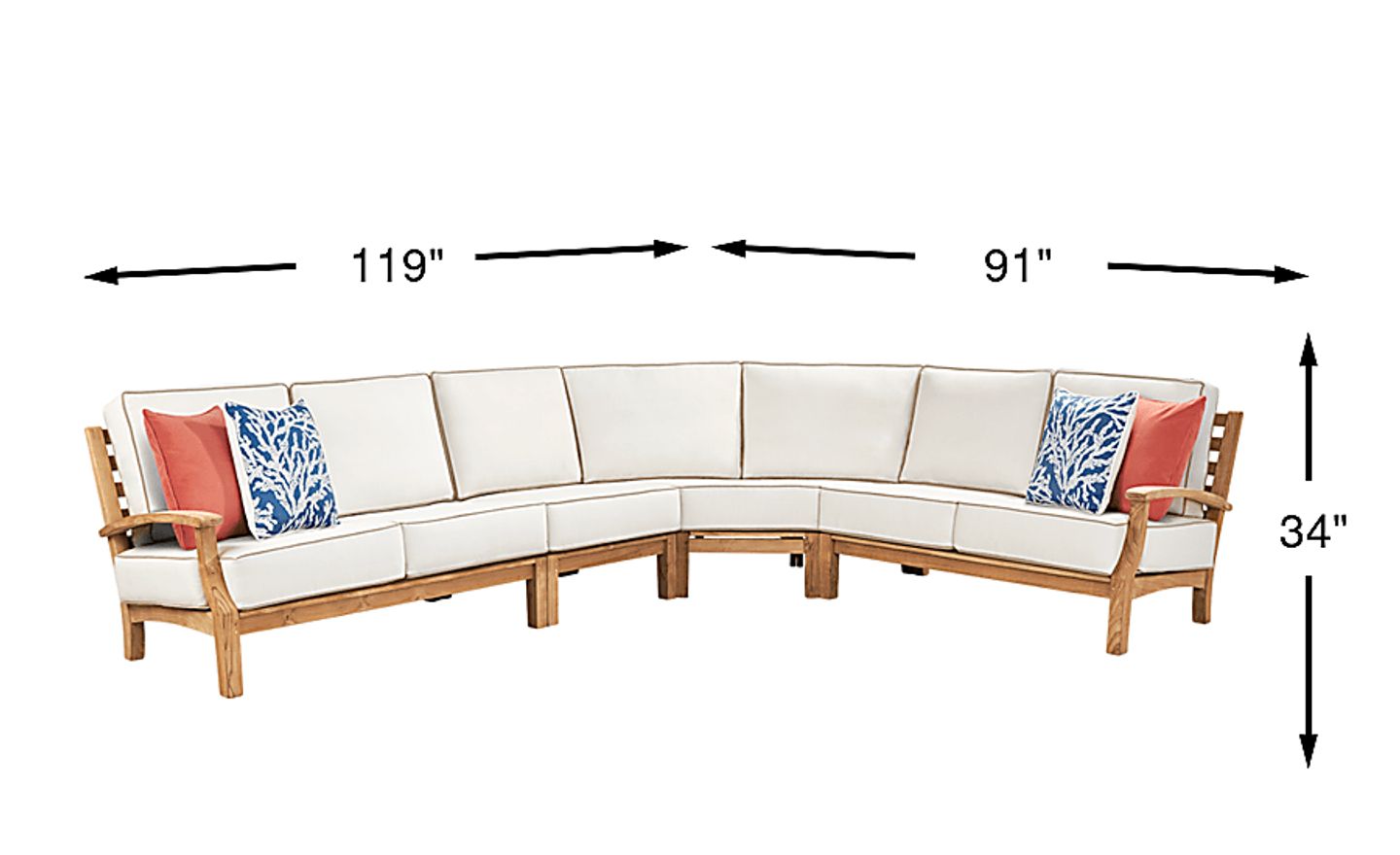 Designed with modern flair to make the most of your patio, the Pleasant Bay sectional combines classic lines with a contemporary silhouette to stunning effect. Crafted from solid teak in a natural finish, this sectional features a slat back for a breezy, casual feel. UV-resistant and colorfast Sunbrella cushions in a vapor color feature coordinating welting details and offer ultimate comfort for outdoor seating. Patterned accent pillows provide this sectional with a decorative finishing touch. 100% Sunbrella fabric. To clean Sunbrella fabric cushions remove dirt and spray on cleaning solution (water and mild soap), then use a soft bristle brush or sponge. Allow cleaning solution to soak into fabric and rinse thoroughly until soap residue is removed. Air dry. Do not dry clean.