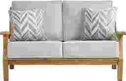 Beautifully designed to make the most of your patio space, the Pleasant Bay loveseat combines classic lines with a contemporary silhouette. Crafted with solid natural teak, this seat features an open slat back for a breezy, casual feel. Dove-colored outdoor cushions feature coordinating welting details and comfortable padding. The cushions are UV resistant and colorfast.