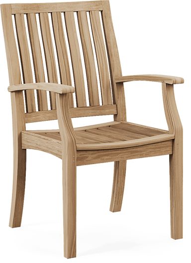 With a laid-back style that invites conversations among guests, the Pleasant Bay dining chair's casual vibe is emphasized by its sleek slat back design and solid natural teak construction. Lightweight enough to move around on your deck, it has two sturdy arms that add support.
