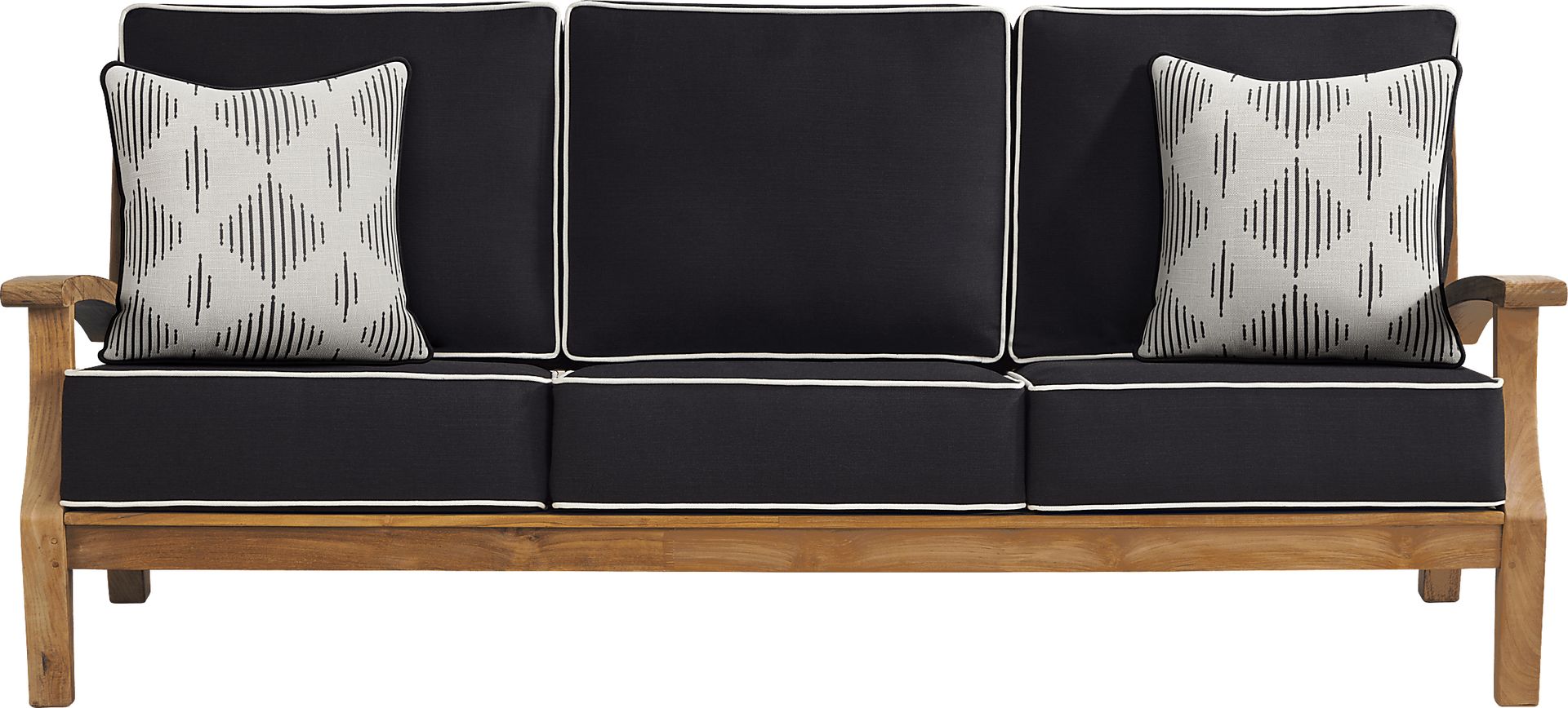 A classic slat-back silhouette and comfortable cushions in a charcoal color add comfort and style to your backyard. Constructed with beautiful, solid natural teak, each UV resistant, padded cushion in performance outdoor fabric features coordinating piping details for a clean, contemporary look. Twin toss pillows add a decorative touch. Select cushion colors also available in Sunbrella fabric.