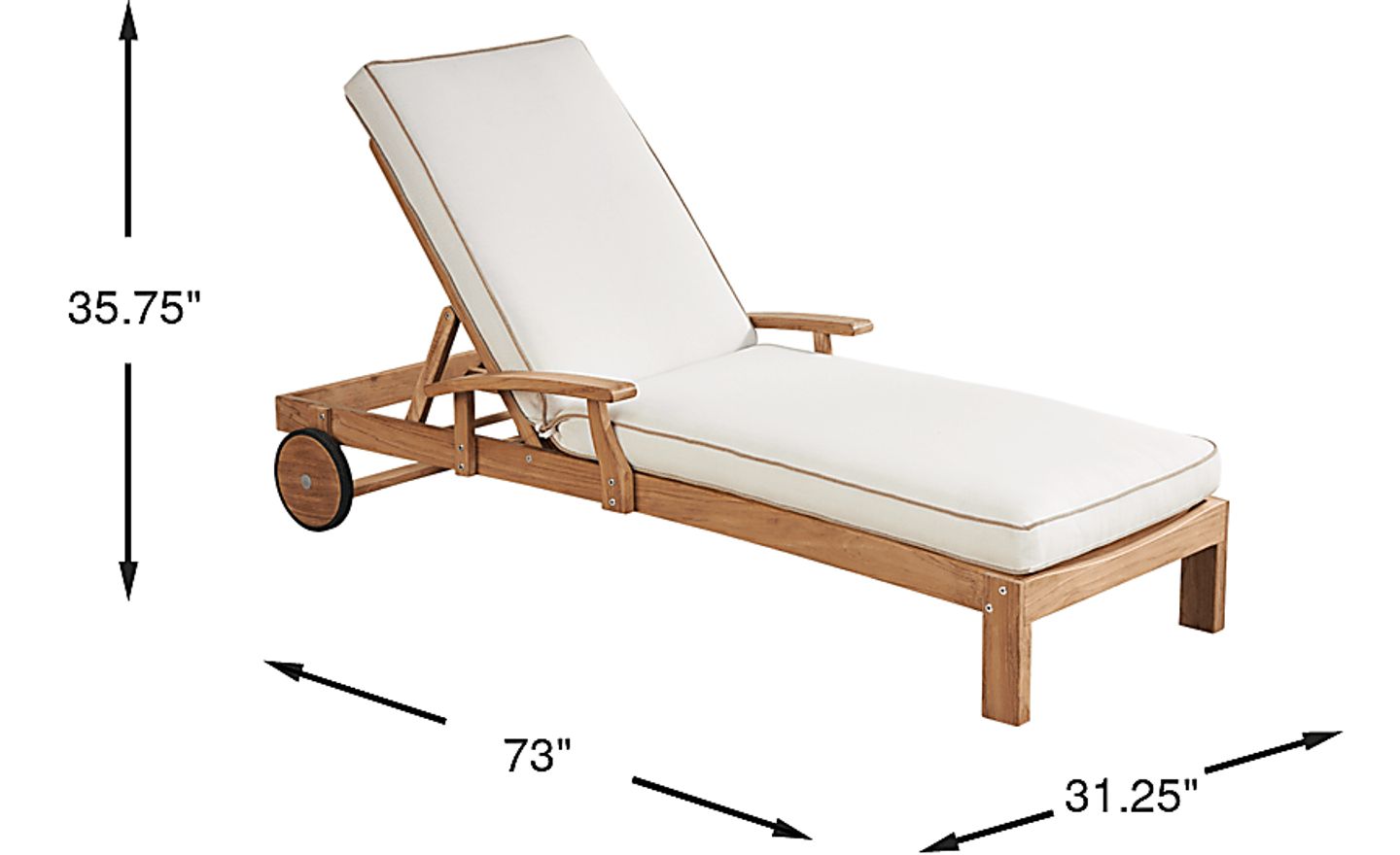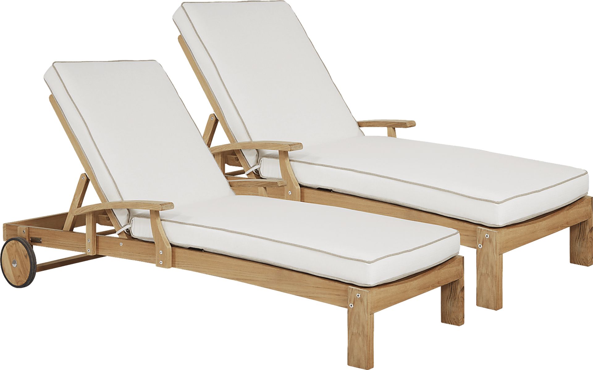The set of two Pleasant Bay chaises allow you to stretch out for easy poolside relaxation. Constructed from beautiful, solid natural teak, the slat back creates a contemporary and breezy silhouette. The sand-colored Sunbrella cushions are resistant against UV rays and mildew so they retain their beautiful color for a longer period of time. Two wheels on the back of each chaise make movement a breeze. 100% Sunbrella fabric. To clean Sunbrella fabric cushions remove dirt and spray on cleaning solution (water and mild soap), then use a soft bristle brush or sponge. Allow cleaning solution to soak into fabric and rinse thoroughly until soap residue is removed. Air dry. Do not dry clean.