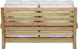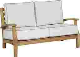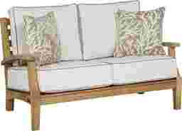 Distinguished by its open slat back design and contemporary silhouette, the Pleasant Bay loveseat is meant for relaxing on your patio with a good book or a good friend. Constructed from solid natural teak, each sand-colored Sunbrella cushion features coordinating piping details and is resistant to UV rays. Two decorative toss pillows add a designer touch. 100% Sunbrella fabric. To clean Sunbrella fabric cushions remove dirt and spray on cleaning solution (water and mild soap), then use a soft bristle brush or sponge. Allow cleaning solution to soak into fabric and rinse thoroughly until soap residue is removed. Air dry. Do not dry clean.