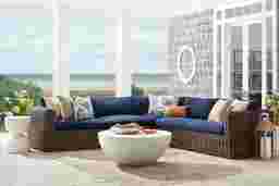 Irresistible tropical charm meets expansive patio seating in stunning fashion with the Plume outdoor sectional from Cindy Crawford Home. This piece provides seating for five on comfortable navy blue cushions upholstered in a UV-resistant outdoor boucle fabric. The weather resistant aluminum frame beneath is wrapped in unique large weave all-weather wicker with a finish that blends multiple shades of brown for a natural look. The tuxedo-style shape of the sectional lends even more casual cool, with oversized track arms that showcase the incredible texture of the extra thick wicker. Two pairs of accent pillows add a final touch of style that can be rearranged for perfectly customized comfort.