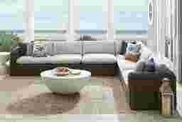 Irresistible tropical charm meets expansive patio seating in stunning fashion with the Plume outdoor sectional from Cindy Crawford Home. This piece provides seating for six on comfortable dove gray cushions upholstered in a UV-resistant outdoor boucle fabric. The weather resistant aluminum frame beneath is wrapped in unique large weave all-weather wicker with a finish that blends multiple shades of brown for a natural look. The tuxedo-style shape of the sectional lends even more casual cool, with oversized track arms that showcase the incredible texture of the extra thick wicker. Two pairs of accent pillows add a final touch of style that can be rearranged for perfectly customized comfort.