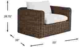 Irresistible tropical charm meets exceptional patio seating in stunning fashion with the Plume outdoor chair from Cindy Crawford Home. This piece offers a seat with comfortable ivory-colored cushions upholstered in a UV-resistant outdoor performance fabric. The weather resistant aluminum frame beneath is wrapped in unique large weave all-weather wicker with a finish that blends multiple shades of brown for a natural look. The tuxedo-style shape of the chair lends even more casual cool, with oversized track arms that showcase the incredible texture of the extra thick wicker.