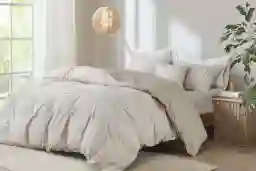 The Plumosa natural 5 Pc full/queen comforter set with removable insert offers a refreshing update to your bedroom. This organic cotton comforter cover features button placket details on the soft natural fabric, for a modern farmhouse look. A removable insert is included and secured by corner ties and a button closure to make washing easier. The 2 matching shams also showcase button placket details that complement the oversized comforter cover, and a decorative pillow completes this bedding set. An antimicrobial treatment provides built-in freshness protection, reducing the growth of odor causing bacteria to keep fabric lasting longer. Items in the set may come in a rolled or compressed packaging, which will need to be fluffed up or steam ironed before use to remove wrinkles.