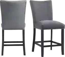 The Pocan counter height stool set is going to look gorgeous in your dining room. This counter height set includes two side chairs, that are upholstered in a transitional, charcoal fabric. Chrome nail head trim outlines the edges of the chairs, instantly adding extra flair to this already stylish duo. The foam cushion seat and back will keep you plenty comfy through even the longest of dinners. The tall solid back adds a little extra drama, creating a look that you'll never tire of Add these chairs to your dining room today Customer assembly is required.