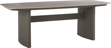 Waves crashing, seagrass swaying, the scent of the boardwalk warming in the sun... the Point Reyes collection invites beachy relaxation to your door whether you live 100 miles from the ocean or one step from the shore. An inspired outdoor classic, this dining set is crafted with rust-resistant aluminum frames in rich brown wrapped in all-weather wicker. Perched on slightly canted back legs, 4 side chairs and 2 arm chairs offer beige seat cushions at an inviting angle. A gorgeous 84" sintered stone top on a stunning double pedestal base gives this set the look of a boat gliding across glassy seas.