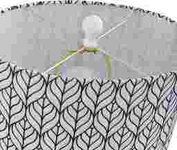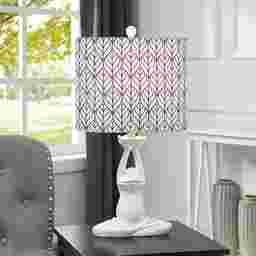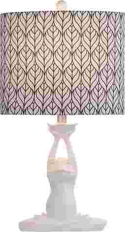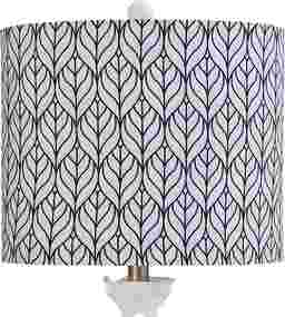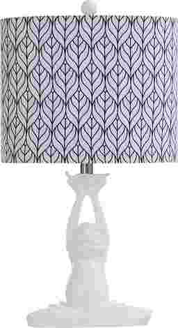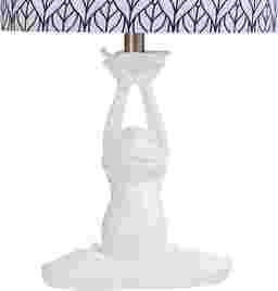 The contemporary Polaris Street lamp pairs a white polyresin frog base with a linen shade featuring a navy blue and white printed pattern. The base is molded into the shape of a frog sitting in a cross-legged position and the pattern on the shade looks like overlapping leaves. This table lamp is a whimsical accent for a family room or living room. Partial assembly may be required.