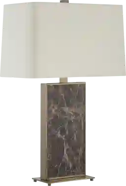 The Pomona Street Brown Lamp showcases a dark brown marble slab encased in a plated brass frame, accented with matching details. The slightly tapered rectangular hardback shade is an off-white linen fabric with soft curved corners. Partial assembly may be required.