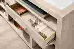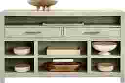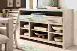 This server is designed for high-capacity organization, featuring seven open shelves for display or easy-access storage and two drawers for tucking away silverware and linens. The combination of open and closed compartments allows you to showcase decorative items or fine china while keeping clutter-free essentials neatly organized.