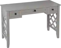 This desk combines traditional aesthetic elements with modern utility. It features decorative quatrefoil cutouts on the side panels that add a sophisticated architectural flair to your decor. The neutral gray finish and classic straight-leg design allow it to serve as a timeless centerpiece that pairs seamlessly with various office chair styles and color palettes.
