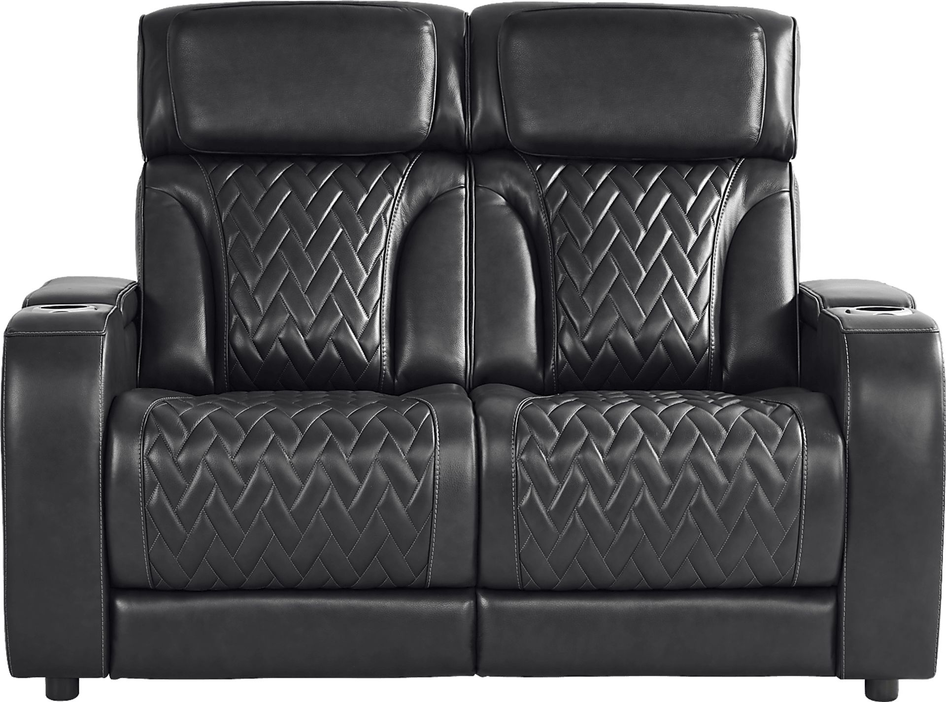 The sleek design and meticulous sophistication of the Port Royal loveseat takes relaxing and unwinding to the next level. Upholstered with top grain leather where the body touches in a midnight color, this piece features stylish radius arms and a chic sewing pattern on the seat and back for a luxurious look and feel. The USB-C port allows you to charge some of your favorite devices. Cupholders on each of the arm rests keep beverages close at hand. Ambient LED theatre lights that run along the base of the loveseat and inside the side storage compartments button the look with an exciting final feature. Top grain leather where the body touches and polyurethane fabric sides and backs.