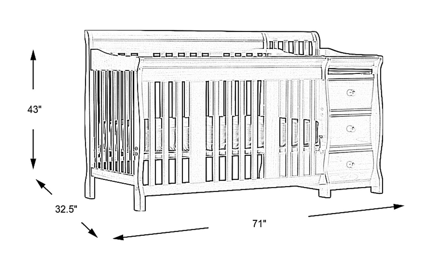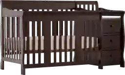 The beautifully solid construction of the Portofino fixed side crib changer by Stork Craft, with its magical sleigh design, makes this a royal centerpiece for your nursery. All four sides are stationary and include an adjustable three position mattress support base. It has a well-built construction made of solid wood and wood products, offered in a non-toxic, durable espresso finish. The attached changer, designed with safety in mind, has an extra deep surface. Set-up this extravagant piece effortlessly with its easy to follow directions. Customer assembly required. 1 year warranty. Crib mattress sold separately.