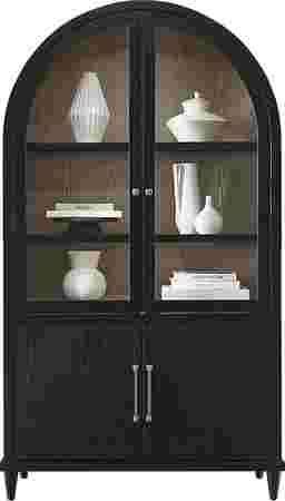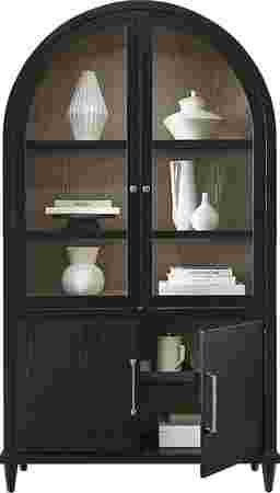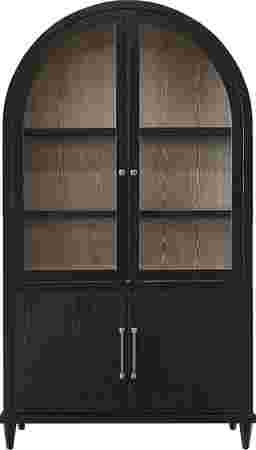Balanced structure and soft detailing in the Portsmouth china cabinet make mealtime a happy, cozy affair. Oak veneers in a black finish provide this accent with a visual and textural contrast against the natural woodgrain inside. The glass doors open onto three display shelves lit with an LED light in the curved top. A two-door cabinet beneath provides more storage space. Board and batten details add to the silhouette for a final touch of modern farmhouse beauty at all angles.