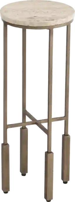 The Preschern brass accent table features modern styling. The martini style table features an antique bronze iron base. The table is completed with a beige, solid travertine tabletop.