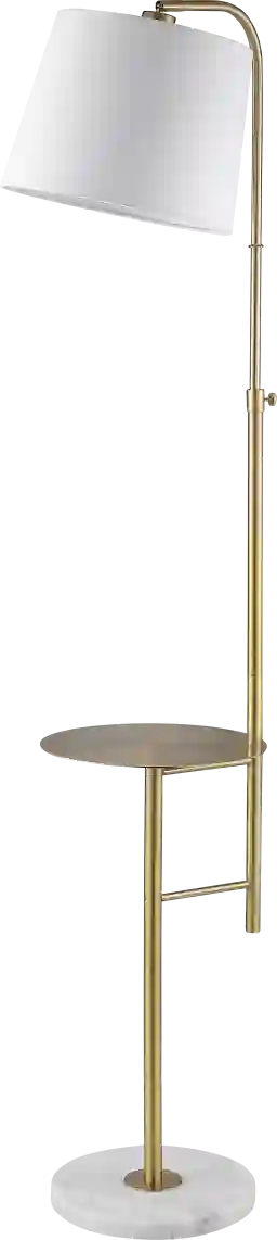 The Pressler Valley Gold Floor Lamp combines a glamorous accent table with soft overhead lighting, perfect for elevating the elegance of small space interiors. This lamp boasts its sculptural style with a brass gold body and white marble base, an angled linen shade enhancing its striking sense of motion. Partial assembly may be required.