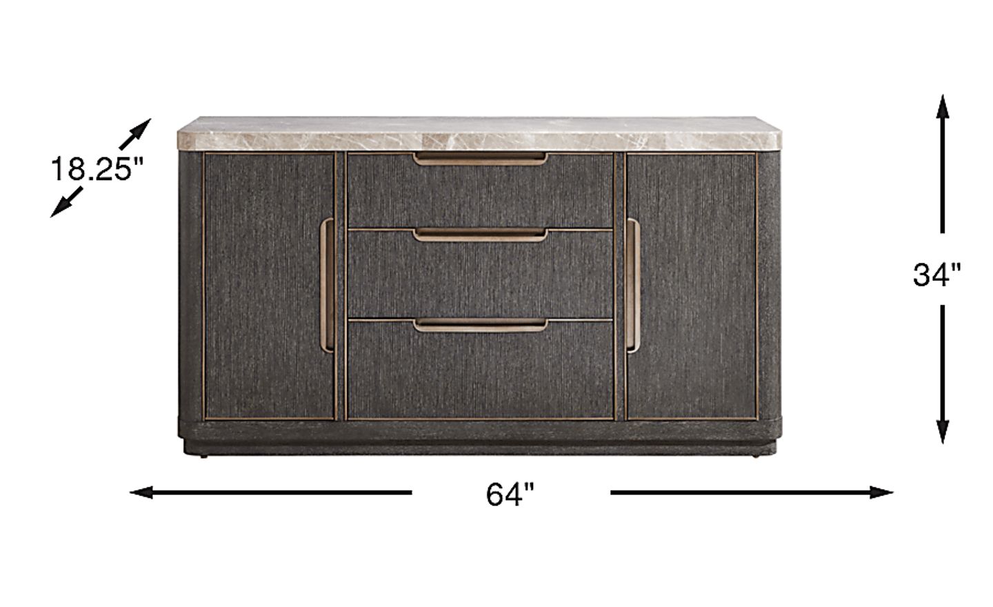 A grounding calm in tune with the rhythm of life infuses your room's natural ease when the Preston Heights collection from Drew & Jonathan comes home, blending peace and tranquility in the heart of your space. Crafted with oak veneers in a dark gray finish, this contemporary buffet makes a bold statement with a clean frame, plinth base and graceful curves. The light stone top and brass finished tracing adds a crisp contrast and polish feel. Two side cabinet doors open to spacious interior storage for dinnerware and linens, while three center drawers keep smaller essentials neatly organized.