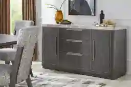 This piece is engineered for maximum organization, featuring two side cabinet doors that open to a spacious interior designed for bulky items like serving platters and linens. Additionally, three center drawers equipped with contemporary bar pulls provide dedicated space for smaller essentials, such as silverware and napkins, keeping your dining area clutter-free.