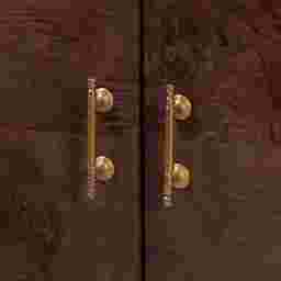 This cabinet features a sophisticated modern silhouette characterized by its minimalist flat panel doors. The brilliantly designed brass metal pulls provide a warm, high-contrast accent against the deep brown wood tones, adding a touch of elegance to the piece. This combination of natural wood textures and metallic hardware allows the cabinet to serve as a versatile focal point that complements both contemporary and transitional interior styles.