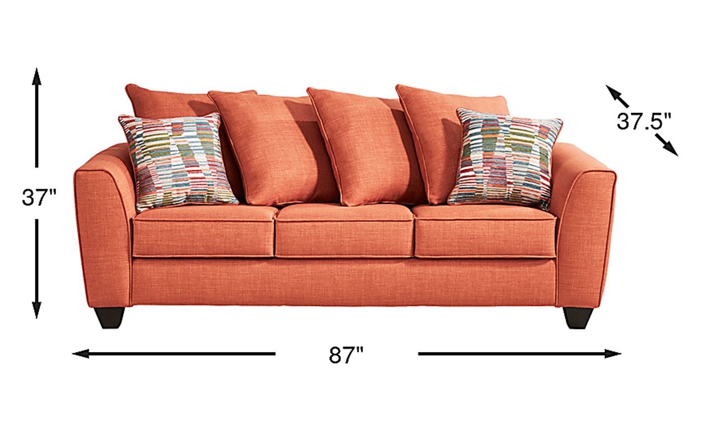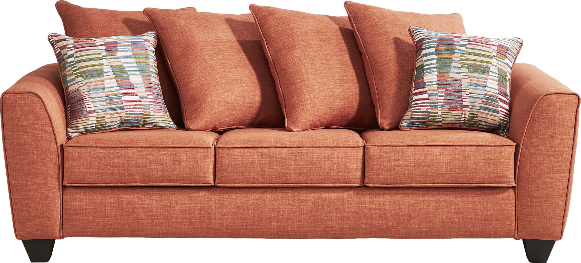 A blend of timeless and sophisticated style, the Primwell Place sofa invites cozy comfort to any space. Upholstered in orange woven fabric, this collection features reversible seat cushions for long-lasting style. Large scatter back pillows provide comfy support as sleek, straight lines add a contemporary touch. Flare arms, block legs and multicolored accent pillows enhance the transitional look. 100% Polyester.
