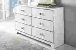 Sleek, contemporary accents meet a modest silhouette of traditional lines and design elements in the transitional Princeton Hall white dresser. Crafted of polar solids and wood veneers, the quality construction features brushed nickel hardware and dustproof bottom drawers.